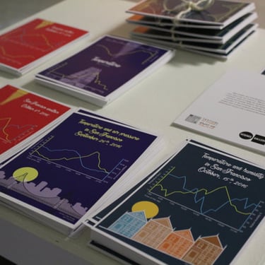 I designed a series of postcards that visually represent weather data from randomly selected dates in San Francisco and Bangalore. On the front, each postcard shows the data visualization; on the back, a QR code links to an audio file that sonifies the weather conditions from that specific day. This allowed viewers to follow the visual graphs while listening to the corresponding sonic interpretation of the data.